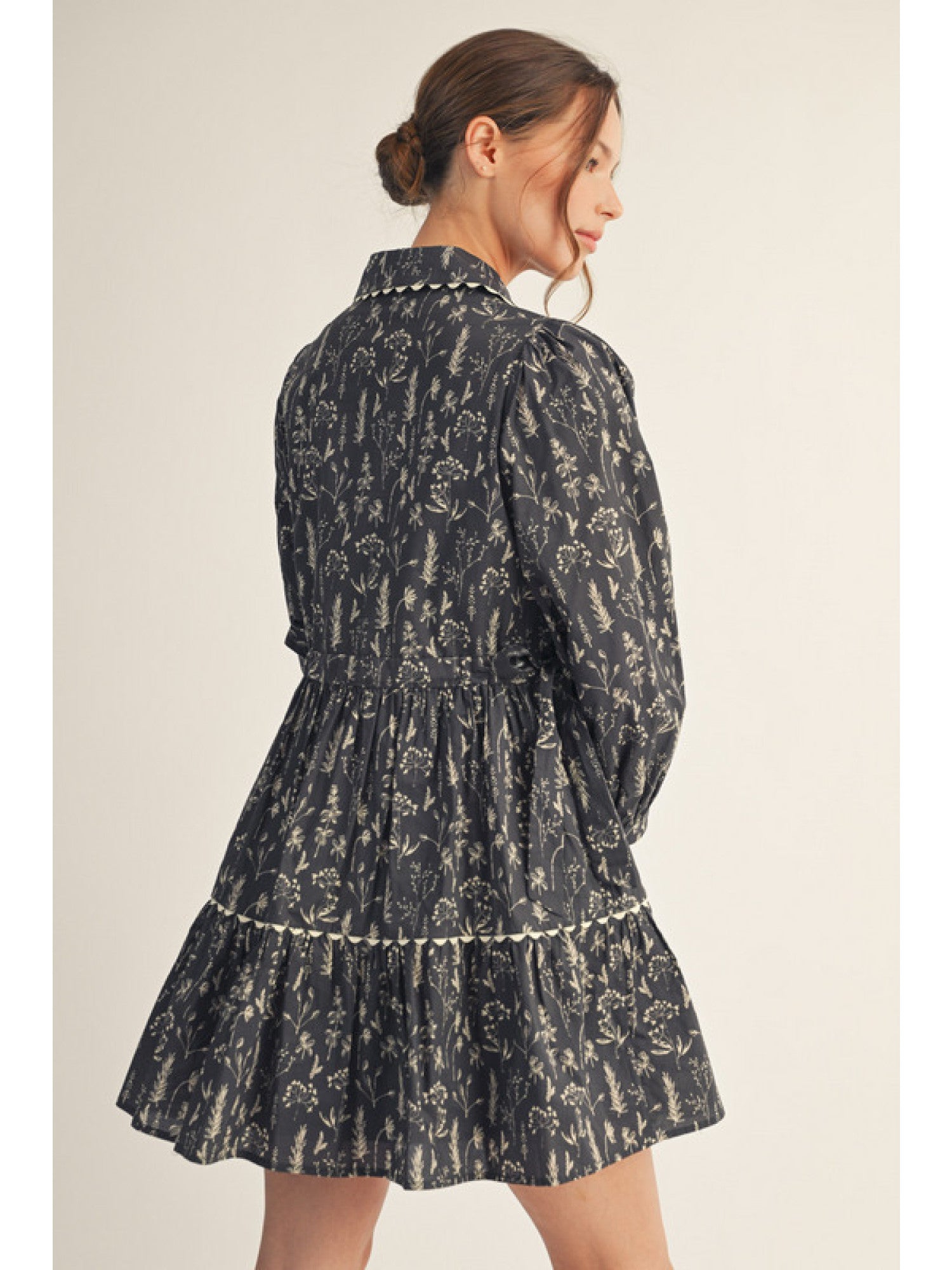 This long-sleeve button-down floral dress combines classic elegance with practical design. Featuring a drawstring waist and side waist tie detail, it allows for a customizable fit that enhances your silhouette. Side pockets add convenience without compromising style, while delicate lace trim accents provide a refined, feminine touch. Ideal for both casual and dressier occasions, this dress offers versatility and comfort with expert craftsmanship.