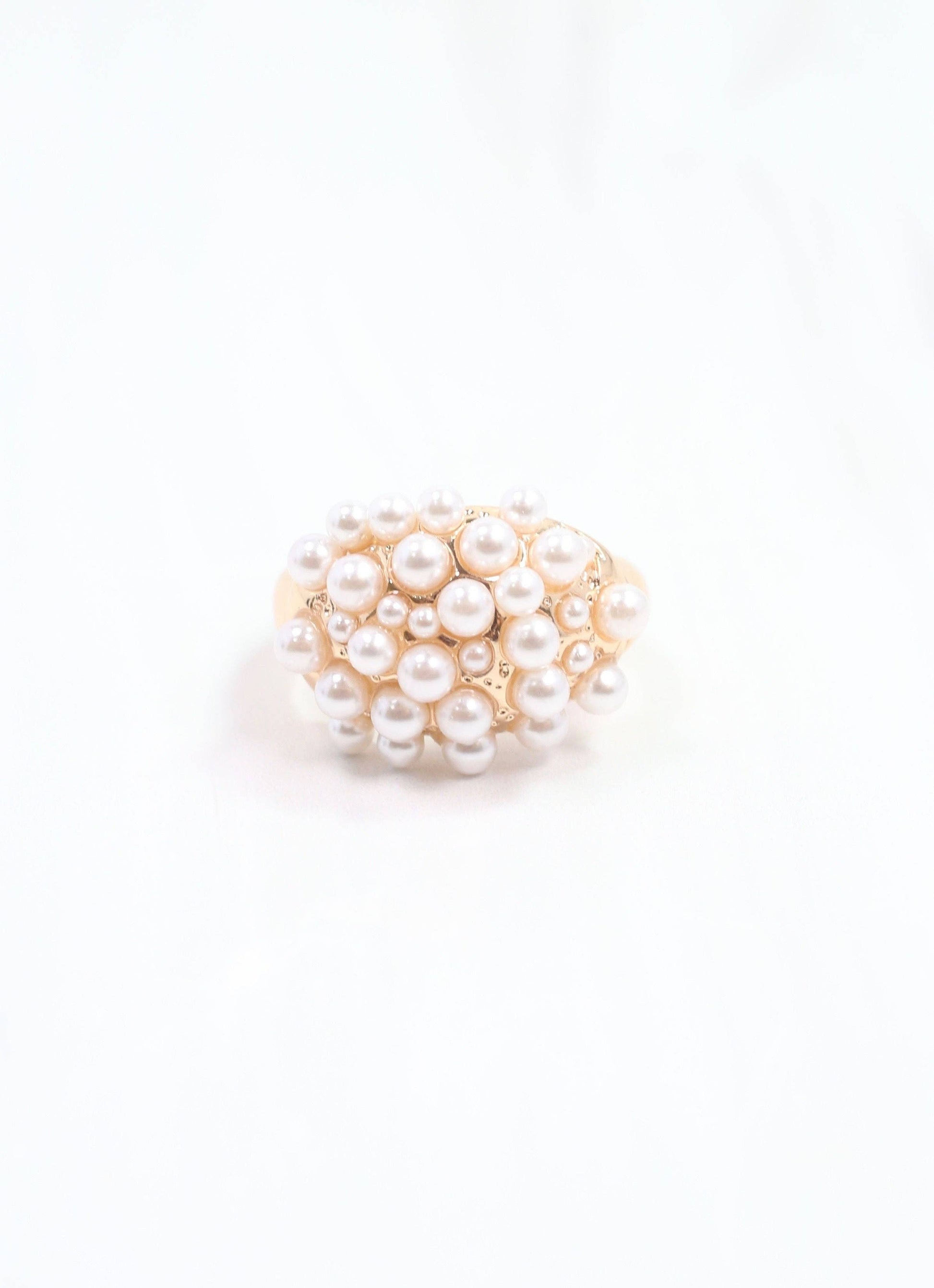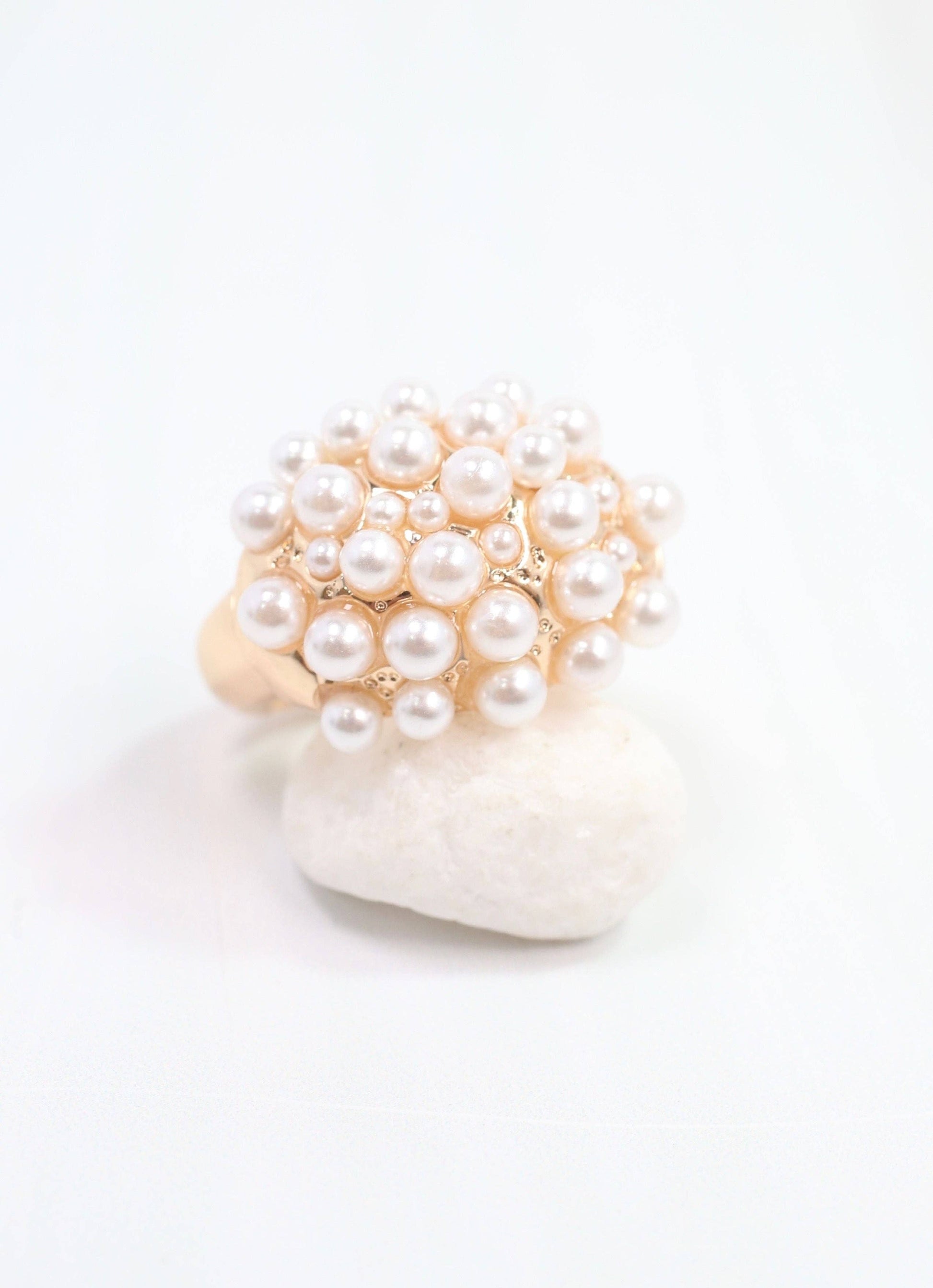 This elegant ring features a pearl cluster on a stretchy gold band. It is sure to add a touch of class to your next outfit. Stretches to fit most ring sizes.