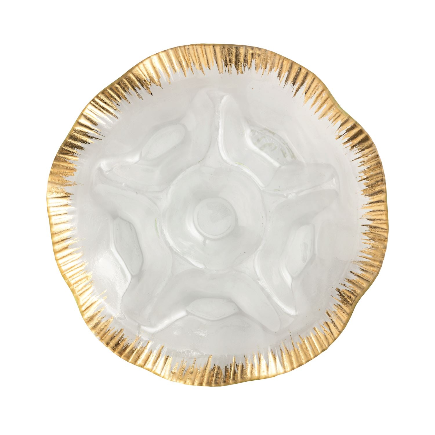 Elevate your serving presentation with this elegant sectioned glass platter, accented by a delicate gold foil ruffle edge. Designed for both style and functionality, the divided sections allow for organized serving of appetizers, desserts, or snacks while the refined gold trim adds a sophisticated touch to any table setting. Ideal for entertaining or special occasions, this platter combines durability with timeless design.