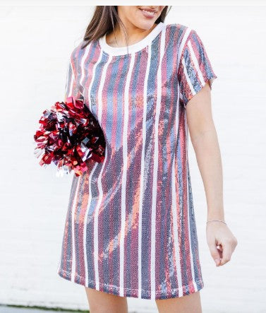 The Julia Dress from the Mary Square Gameday Collection features bold red, white, and blue sequined stripes that capture attention with every move. Designed for standout style, this dress combines festive colors with shimmering sequins, perfect for celebrating game day or patriotic events. Its eye-catching design ensures you’ll be the center of attention while enjoying comfort and confidence throughout your day.